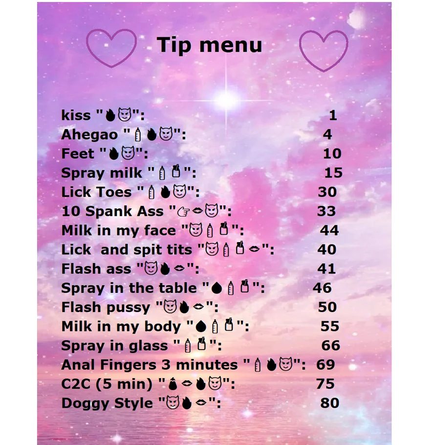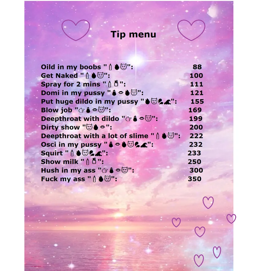 ท่าหมา, อาเฮะกาโอะ, ดิลโด้หรือไวเบรเตอร์, ระบำเปลื้องผ้า, ใช้กำปั้น, เซ็กส์ทอย, โชว์น้ำมัน, เต้นยั่ว, ช่วยตัวเอง, เปลือยอก, เฟติชเท้า, แอนัล, ตีก้น, คุยเรื่องลามก, แอนัลแล้วต่อด้วยออรัล, สอดใส่สองทาง, ดีปโทรต, โบลว์จ๊อบ, ใช้หน้าอก, ถึงจุดสุดยอด, น้ำพุ่ง, ฮาร์ดคอร์, คาวเกิร์ล, ท่า 69, ใช้นิ้ว, สูบบุหรี่, ของเล่นแอนัล, ทเวิร์ก, โชว์ใต้กระโปรง